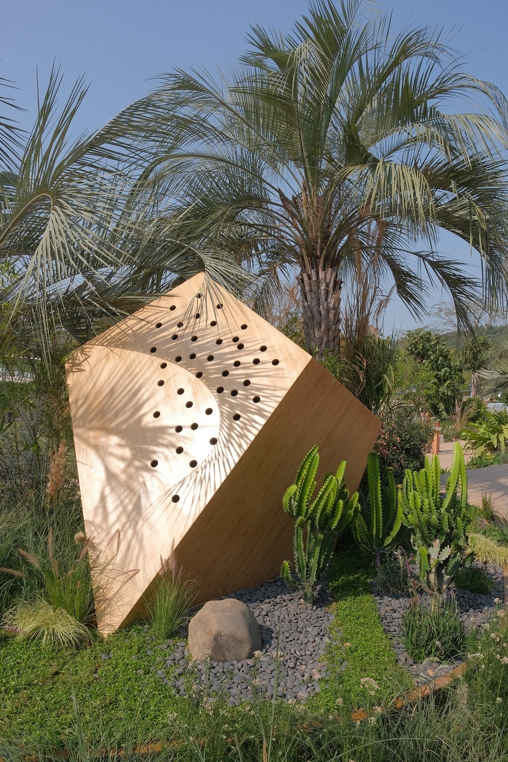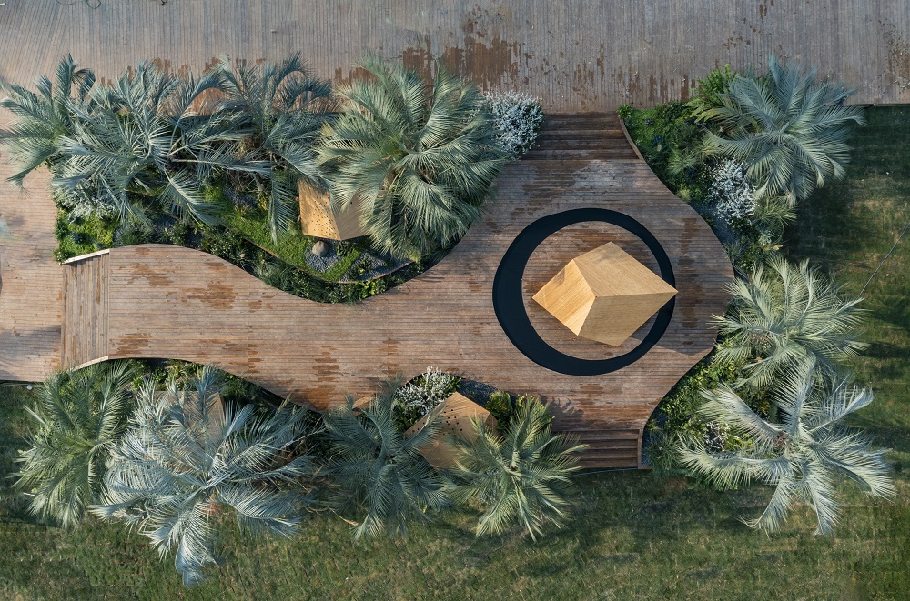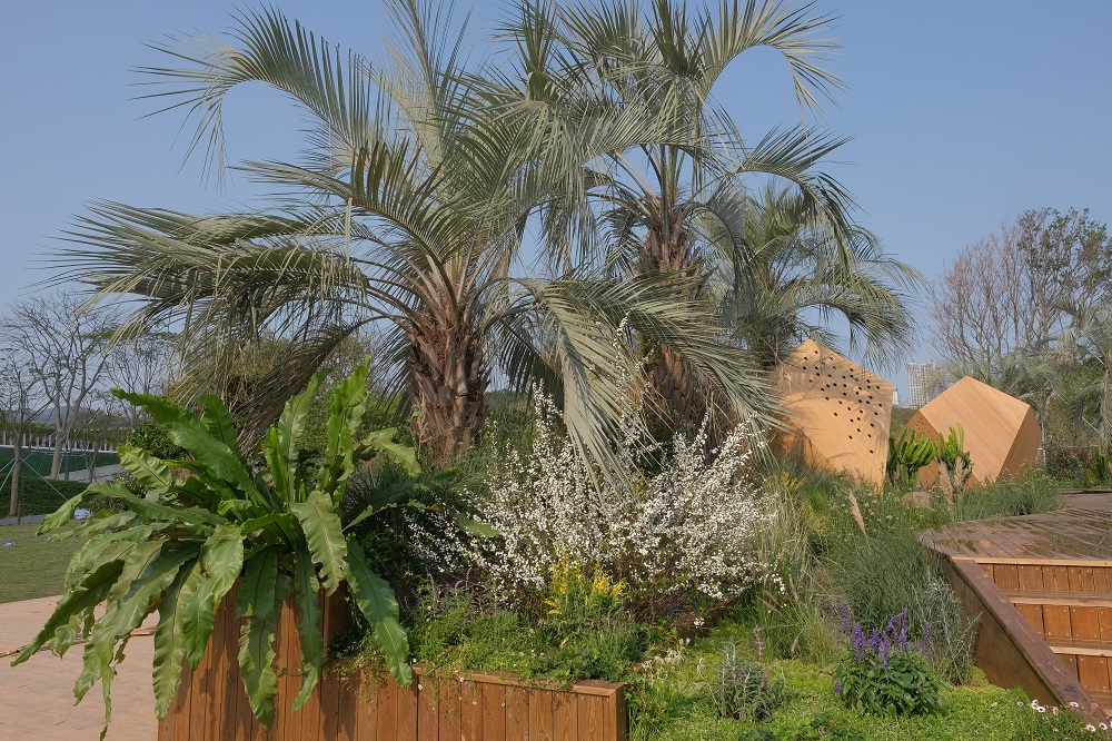 本展園是由烏拉圭園林設計大師阿里漢德羅·奧尼爾、葆拉·里爾和我國香港設計師胡慧中聯(lián)合設計的花園,名為“余境”,意為冰冷突兀的城市建筑被大自然修復的過程,旨在喚醒大家的意識,讓城市地融入自然環(huán)境當中,提倡打造一種人與自然之間的和諧共處關系。“余境”的整體構(gòu)圖受中國傳統(tǒng)圖案的啟發(fā),種植方案的靈感來自烏拉圭典型生態(tài)系統(tǒng)——著名的布迪椰子樹林。以特色布迪椰子樹為主的野生自然風光,配以象征著大灣區(qū)城市景觀的“亭臺樓閣”,印證了城市發(fā)展與自然相互作用、茁壯共生的緊密關系。
