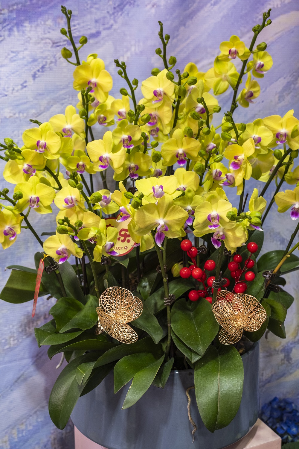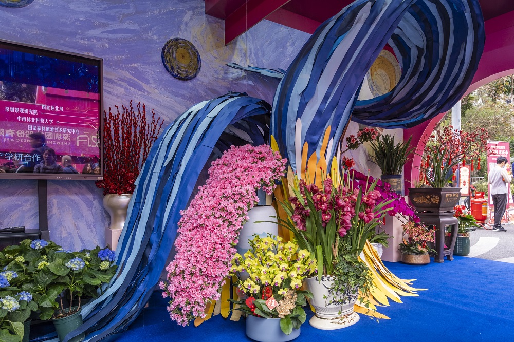 花市的展位設計復刻了2015年以前的傳統花市門樓,以“中國紅”為基調,打造具有嶺南特色的門頭鋪位,恢弘大氣,節日氛圍濃厚。其中,森斯環境展位作為本次花市的特別展位(花市門樓右側第一家),以印象派畫家梵·高的《星空》為主題,用盤旋、糾纏的鋼絲作為骨架,將黃色與藍色的條形卡紙交疊其上,搭建出富有運動和變化的“星空”,營造了自由浪漫的時空感。